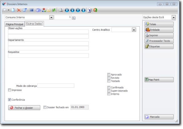 Um dossier interno que esteja configurado com esta opção, passa a apresentar na página "Outros Dados", a opção (junto ao botão de fechar dossier) que permite antes de gravar um dossier, especificar se ele se encontra em conferência.