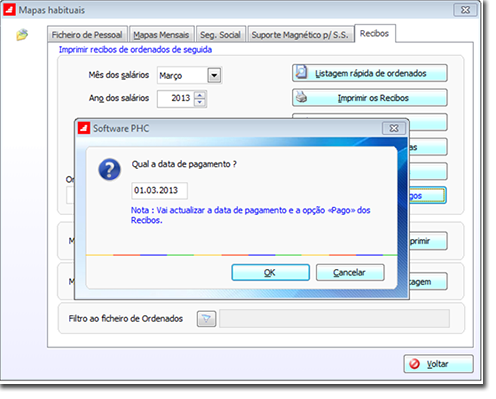Ao aceder a este separador tem uma opção “Marcar Recibos como pagos”, no qual poderá indicar a data de pagamento: