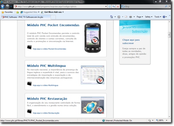 área PHC TV que contém um apanhado de todos os vídeos