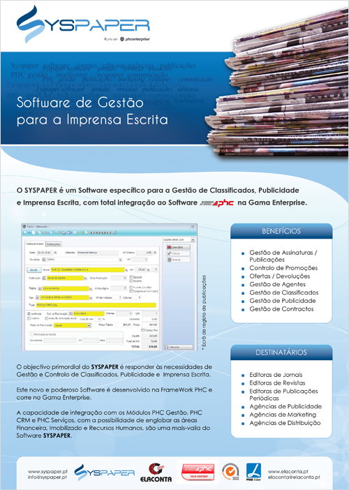 é o Software de excelência, desenvolvido em Portugal, para Gestão de Classificados, Publicidade e Imprensa Escrita, com total integração com PHC.